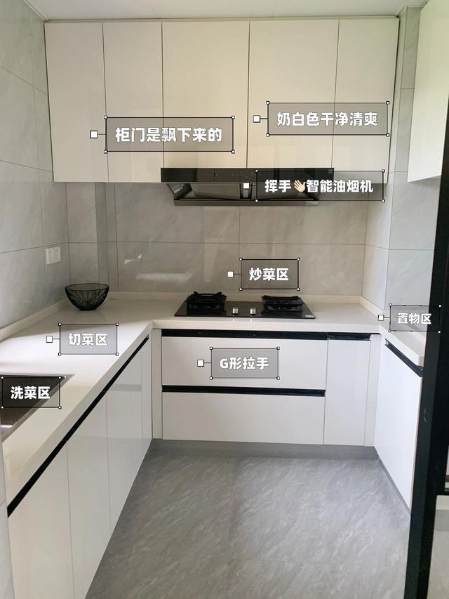 橱柜呈U型布局,“洗、切、炸”三个区域进行了合理划分。浅灰色的瓷砖搭配白色的橱柜,一个非常经典的色彩组合,清爽诱人。。