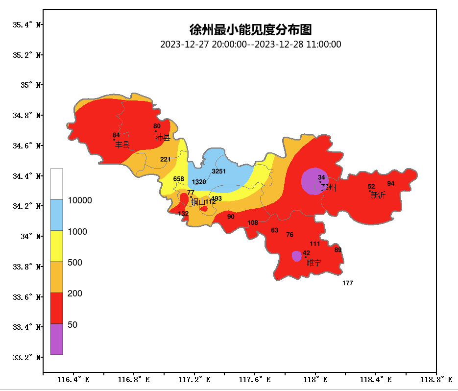 12月27日21时起,我市能见度开始明显下降,截至今天上午11时,全市普遍出现浓雾和强浓雾,最小能见度仅为34米,出现在凌晨1点至2点,预计中午前后大雾逐渐消散,转为轻-中度霾。