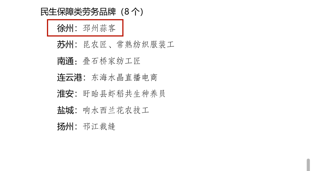 近日,江苏省人力资源和社会保障厅发布关于2023年度省级劳务品牌拟确定名单的公示,其中“邳州蒜客”获得民生保障类劳务品牌。