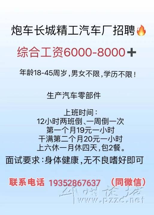 炮车厂区下午二点面试 普工 首月19,次月20一小时,综合薪资6000 +管吃两餐19352867637