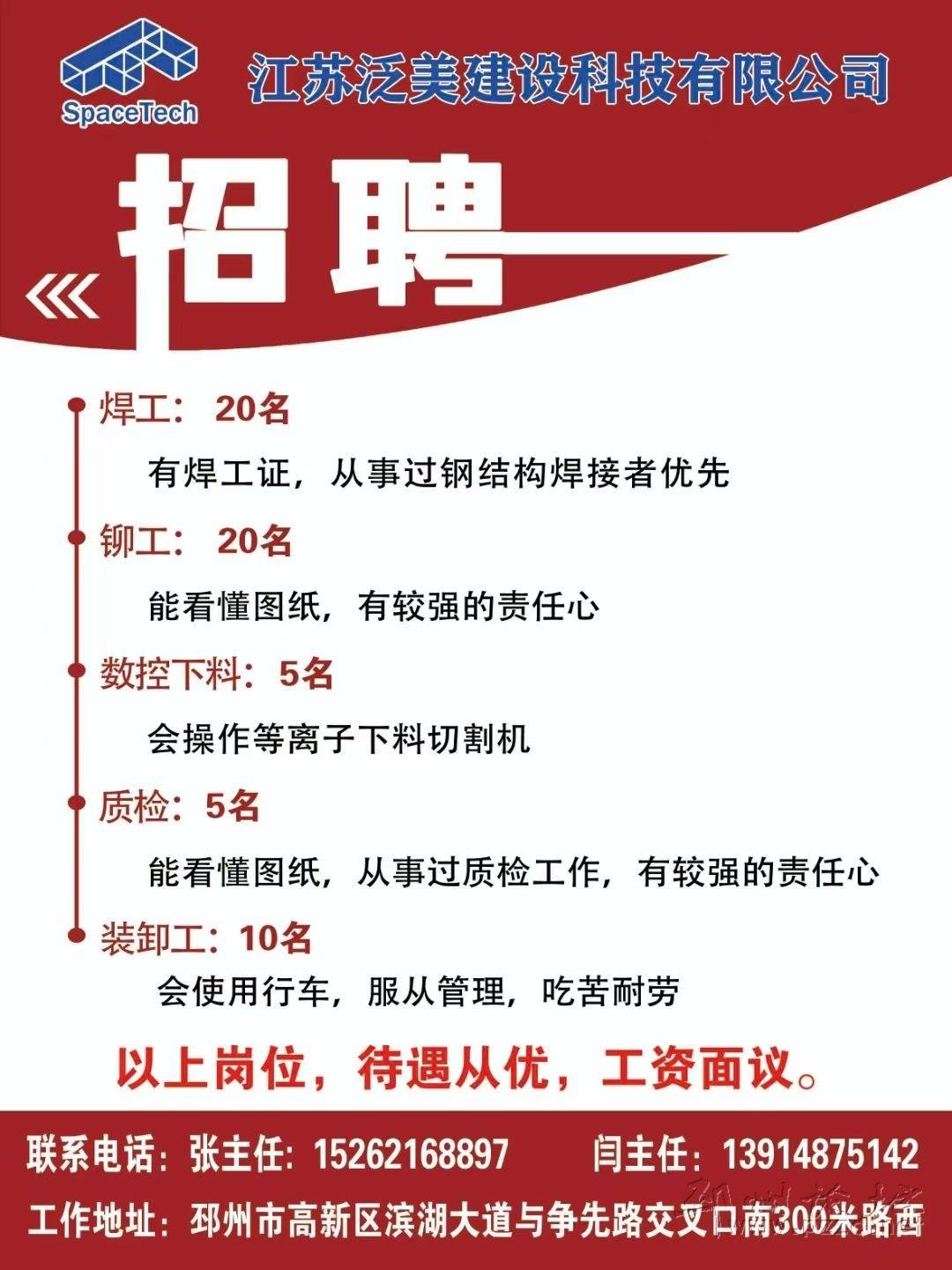 江苏泛美建设科技招聘焊工、质检员、装卸工、数控下料、铆工等