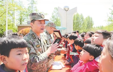 近日,江苏省邳州市港上镇退役军人服务站开展国防教育进校园活动。图为民兵给学生讲解军队勋章奖章知识。郑耀耀摄