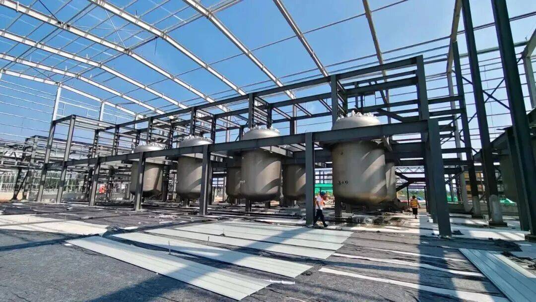 该项目总投资18亿元,可年产20万吨锂离子电池电解液,规划建设储料罐区、成品仓库、复配车间等功能区域。目前厂房主体已基本完工,正进行设备安装,总体进度达90%。为缩短工期,项目部采用“立体交叉施工法”,组织多队伍、多模块同步施工,预计11月底进入试生产筹备阶段。