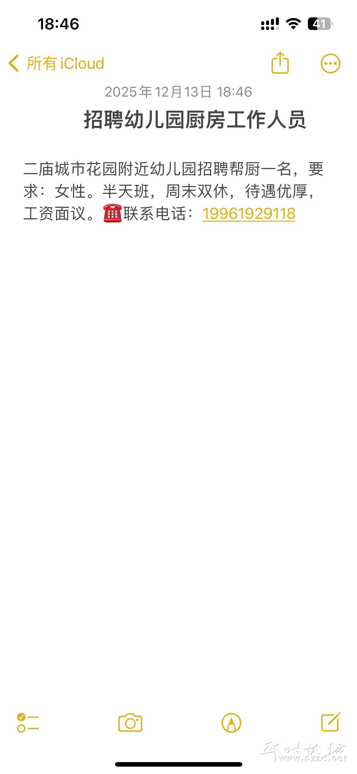 二庙城市花园附近幼儿园招聘帮厨一名,要求:女性。半天班,周末双休,待遇优厚,工资面议。联系电话:19961929118