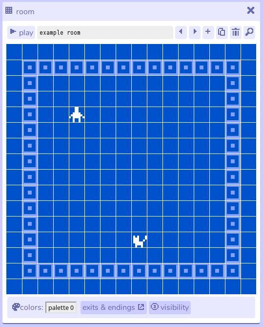 Bitsy 的基本元素是一个代表玩家的头像、发生游戏动作的房间、精灵(可以与之互动的非玩家角色)和物品。有一个用于创建这些元素的位图编辑器,它也支持简单的两帧动画。