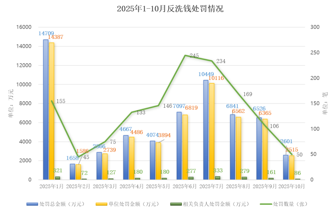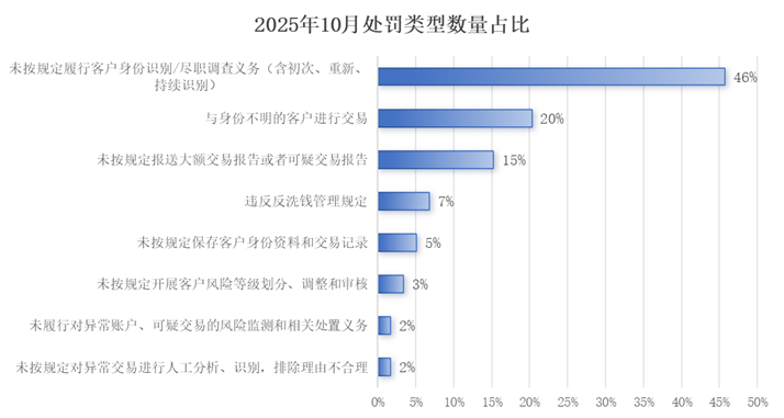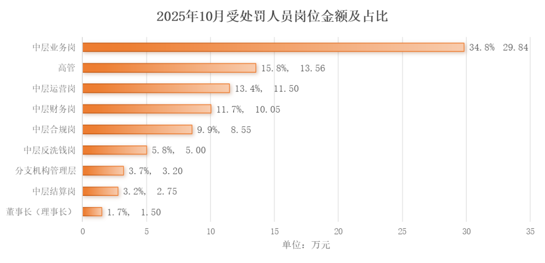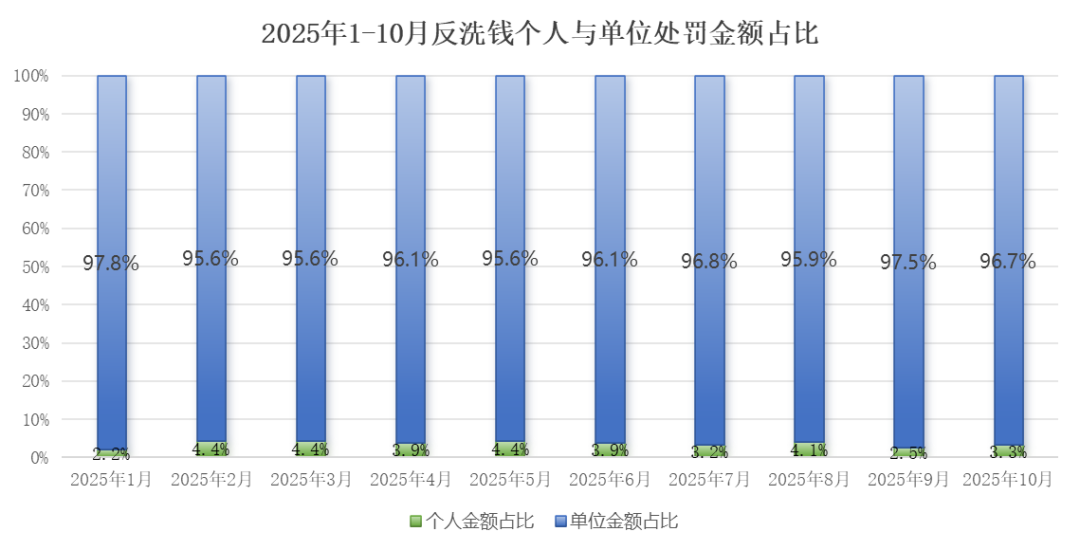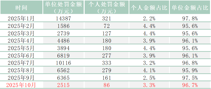 2025年10月,反洗钱“双罚”罚单数量占比为94%(既处罚机构,也处罚相关责任人),个人处罚金额区间为1万- 12.75万元。10月共31名责任人受到处罚,总处罚金额为86万元。从罚单金额分布看,五万元及以下罚单占比最高,达59.5%,5万-10万元(含)罚单占比25.7%,10万-15万元(含)罚单占比14.8%。
