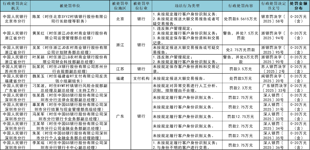 个人处罚典型案例:时任中国GS银行股份有限公司深圳市分行银行卡业务部副总经理冯某军,因未按规定履行客户身份识别义务被中国人民银行深圳市分行处以12.75万元罚款。处罚岗位分布:本月受处罚人员覆盖岗位包括银行行长、副行长、行长助理、公司董事长,分公司总经理助理、副总经理,运营部、财务部等部门负责人,反洗钱小组副组长等。覆盖机构前中后台各业务线条。从平均处罚金额来看,10月中层反洗钱岗的平均处罚金额最高,为5万元,超过其他岗位的平均处罚金额。这提示我们,作为反洗钱“第二道防线”的反洗钱管理部门,应当切实起到牵头抓总的作用,不仅要完善制度体系,更要将监管压力和最新政策有效传导至高管和工作人员,通过强化培训、督导和考核,确保前中后台各业务线条将反洗钱要求内化为日常操作,从而打好防范洗钱风险的基础。四、处罚地区