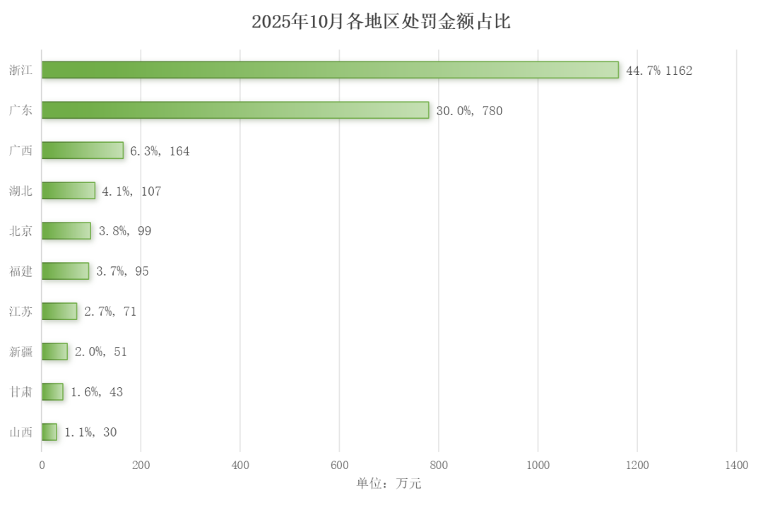 2025年10月,全国共有10个省级行政区涉及反洗钱监管处罚,较上月减少1个,从处罚金额看,浙江省以1162万元居首,占全国总处罚金额的44.7%;广东省以780万元紧随其后,占比30.0%。处罚地区具体情况见下图。