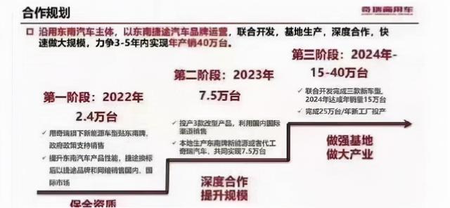 根据PPT所透露的消息,届时双方将联合开发、运营东南捷途这样一个全新品牌,同时也给出了3-5年内实现年产销40万台的宏远规划。与此同时,对于2022年、2023年以及2023年这3个阶段的工作重点,PPT也给出了明确的指示。